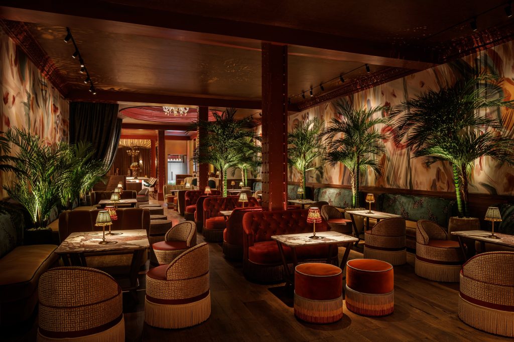 A custom-designed mural crafted to enhance the intimate, moody atmosphere of the space, digitally printed on commercial-grade substrate to deliver depth, character, and lasting performance in a high-traffic hospitality setting.